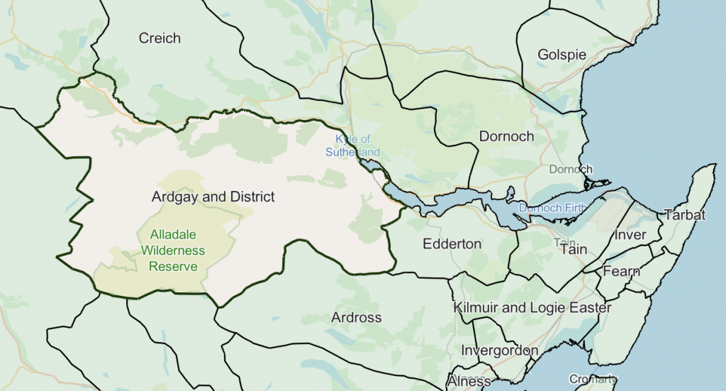 AREA MAPS: Dornoch Firth National Scenic Area, local communities in the Kyle of Sutherland area, and an interactive map of Ardgay & District CC area.